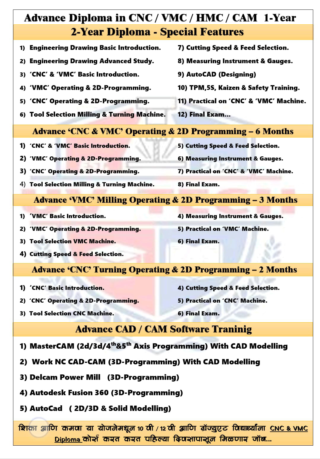 Our comprehensive training programs are designed to provide in-depth understanding of machining processes, tool path generation, CAD/CAM integration, and real-time project execution. With a strong focus on hands-on practice, students gain practical exposure to industrial standards, machine operations, and production techniques.